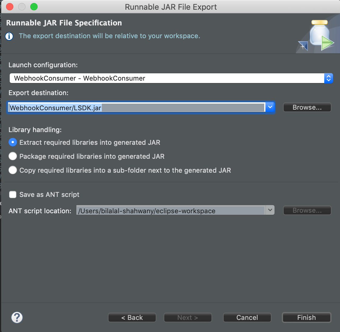 12. Select the Runnable JAR File option and click Next, then specify the JAR file name and click Finish.