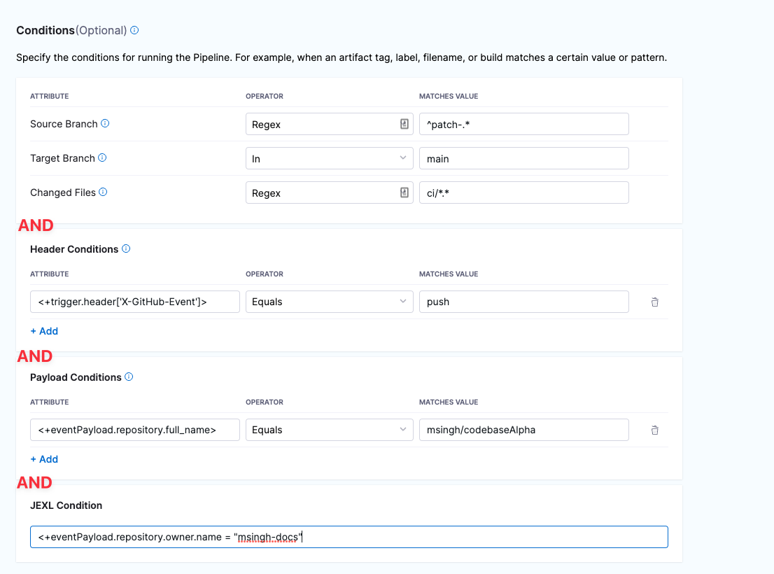 For example, the configuration in the following image requires that the event match all conditions for Source Branch, Target Branch, Changed Files, Header Conditions, Payload Conditions, and JEXL Condition to activate the trigger.