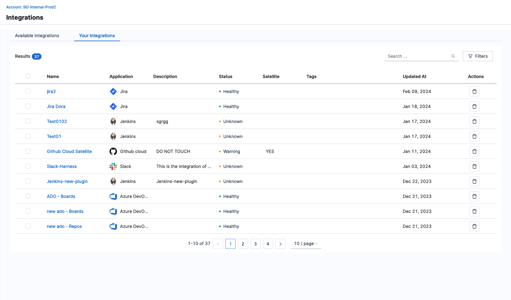 - Click on the delete icon next to the integration you want to remove.